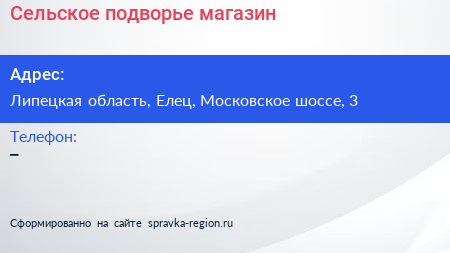 Сельское подворье, магазин по адресу Липецкая область, Елец, Московское шоссе, 3 в дальнейшем Организация, размещена в следующих категориях: