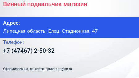 Винный подвальчик, магазин по адресу Липецкая область, Елец, Стадионная, 47 в дальнейшем Организация, размещена в следующих категориях:
