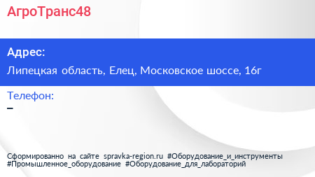 АгроТранс48 по адресу Липецкая область, Елец, Московское шоссе, 16г в дальнейшем Организация, размещена в следующих категориях:
