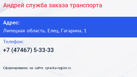 Андрей, служба заказа транспорта по адресу Липецкая область, Елец, Гагарина, 1 в дальнейшем Организация, размещена в следующих категориях: