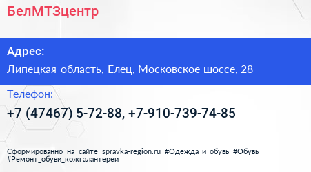 БелМТЗцентр по адресу Липецкая область, Елец, Московское шоссе, 28 в дальнейшем Организация, размещена в следующих категориях: