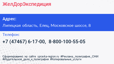 ЖелДорЭкспедиция по адресу Липецкая область, Елец, Московское шоссе, 8 в дальнейшем Организация, размещена в следующих категориях: