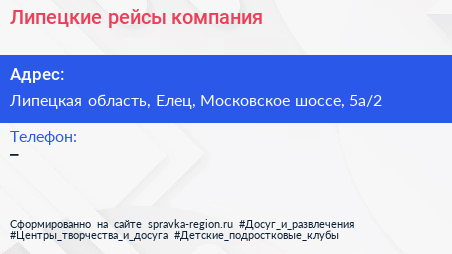Липецкие рейсы, компания по адресу Липецкая область, Елец, Московское шоссе, 5а/2 в дальнейшем Организация, размещена в следующих категориях: