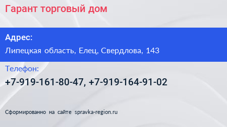 Гарант, торговый дом по адресу Липецкая область, Елец, Свердлова, 143 в дальнейшем Организация, размещена в следующих категориях: