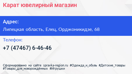 Карат, ювелирный магазин по адресу Липецкая область, Елец, Орджоникидзе, 68 в дальнейшем Организация, размещена в следующих категориях: