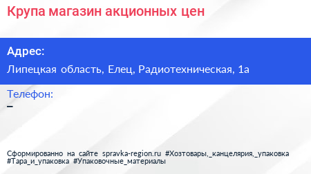 Крупа, магазин акционных цен по адресу Липецкая область, Елец, Радиотехническая, 1а в дальнейшем Организация, размещена в следующих категориях: