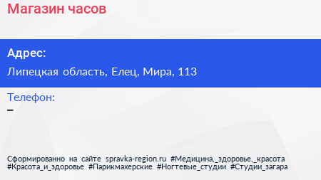 Магазин часов по адресу Липецкая область, Елец, Мира, 113 в дальнейшем Организация, размещена в следующих категориях:
