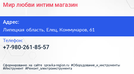 Мир любви, интим-магазин по адресу Липецкая область, Елец, Коммунаров, 61 в дальнейшем Организация, размещена в следующих категориях: