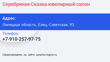 Серебряная Сказка, ювелирный салон по адресу Липецкая область, Елец, Советская, 93 в дальнейшем Организация, размещена в следующих категориях: