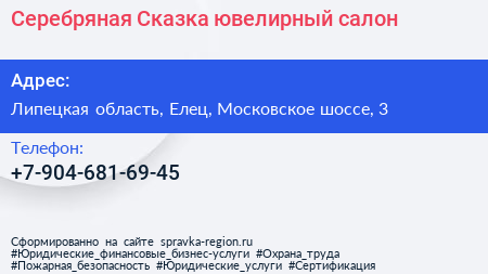 Серебряная Сказка, ювелирный салон по адресу Липецкая область, Елец, Московское шоссе, 3 в дальнейшем Организация, размещена в следующих категориях:
