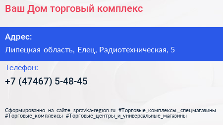 Ваш Дом, торговый комплекс по адресу Липецкая область, Елец, Радиотехническая, 5 в дальнейшем Организация, размещена в следующих категориях: