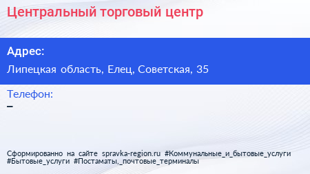 Центральный, торговый центр по адресу Липецкая область, Елец, Советская, 35 в дальнейшем Организация, размещена в следующих категориях: