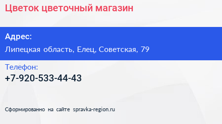 Цветок, цветочный магазин по адресу Липецкая область, Елец, Советская, 79 в дальнейшем Организация, размещена в следующих категориях: