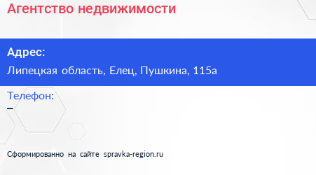 Агентство недвижимости по адресу Липецкая область, Елец, Пушкина, 115а в дальнейшем Организация, размещена в следующих категориях: