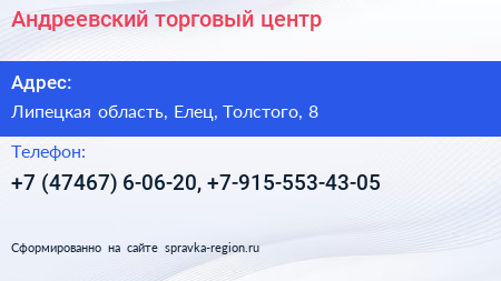 Андреевский, торговый центр по адресу Липецкая область, Елец, Толстого, 8 в дальнейшем Организация, размещена в следующих категориях: