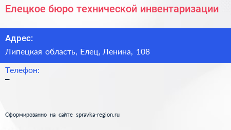 Елецкое бюро технической инвентаризации по адресу Липецкая область, Елец, Ленина, 108 в дальнейшем Организация, размещена в следующих категориях: