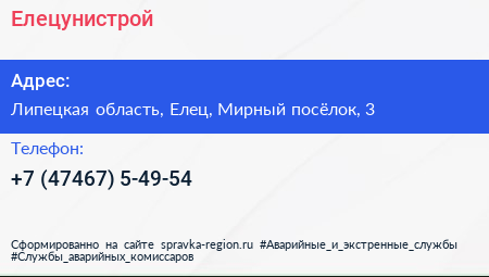 Елецунистрой по адресу Липецкая область, Елец, Мирный посёлок, 3 в дальнейшем Организация, размещена в следующих категориях: