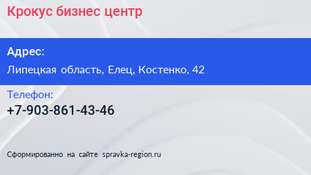 Крокус, бизнес-центр по адресу Липецкая область, Елец, Костенко, 42 в дальнейшем Организация, размещена в следующих категориях: