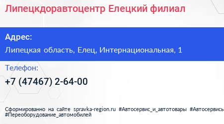 Липецкдоравтоцентр, Елецкий филиал по адресу Липецкая область, Елец, Интернациональная, 1 в дальнейшем Организация, размещена в следующих категориях: