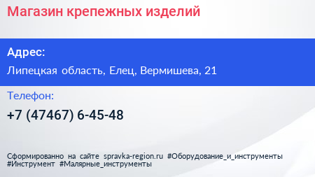 Магазин крепежных изделий по адресу Липецкая область, Елец, Вермишева, 21 в дальнейшем Организация, размещена в следующих категориях: