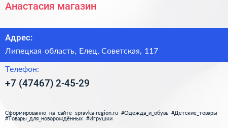 Анастасия, магазин по адресу Липецкая область, Елец, Советская, 117 в дальнейшем Организация, размещена в следующих категориях: