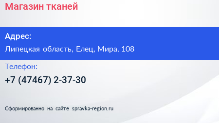 Магазин тканей по адресу Липецкая область, Елец, Мира, 108 в дальнейшем Организация, размещена в следующих категориях:
