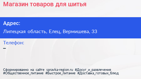 Магазин товаров для шитья по адресу Липецкая область, Елец, Вермишева, 33 в дальнейшем Организация, размещена в следующих категориях: