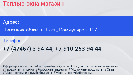 Теплые окна, магазин по адресу Липецкая область, Елец, Коммунаров, 117 в дальнейшем Организация, размещена в следующих категориях: