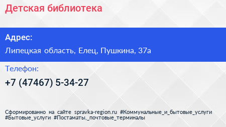 Детская библиотека по адресу Липецкая область, Елец, Пушкина, 37а в дальнейшем Организация, размещена в следующих категориях: