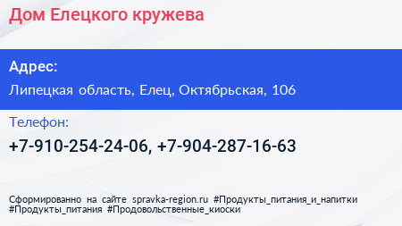 Дом Елецкого кружева по адресу Липецкая область, Елец, Октябрьская, 106 в дальнейшем Организация, размещена в следующих категориях: