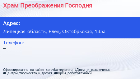 Храм Преображения Господня по адресу Липецкая область, Елец, Октябрьская, 135а в дальнейшем Организация, размещена в следующих категориях: