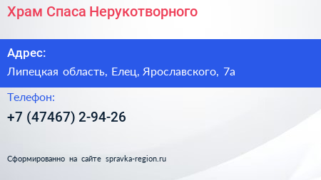 Храм Спаса Нерукотворного по адресу Липецкая область, Елец, Ярославского, 7а в дальнейшем Организация, размещена в следующих категориях: