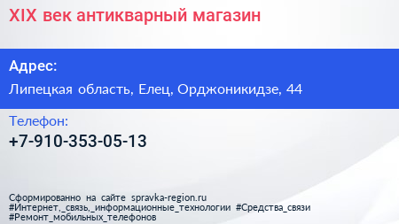 XIX век, антикварный магазин по адресу Липецкая область, Елец, Орджоникидзе, 44 в дальнейшем Организация, размещена в следующих категориях: