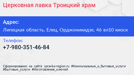 Церковная лавка, Троицкий храм по адресу Липецкая область, Елец, Орджоникидзе, 46 вл10 киоск в дальнейшем Организация, размещена в следующих категориях: