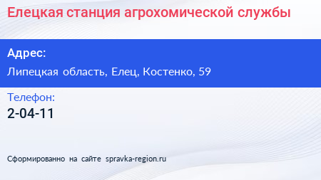 Елецкая, станция агрохомической службы по адресу Липецкая область, Елец, Костенко, 59 в дальнейшем Организация, размещена в следующих категориях: