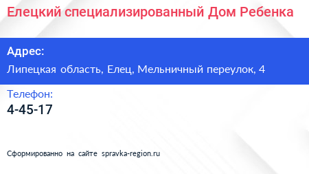 Елецкий специализированный Дом Ребенка по адресу Липецкая область, Елец, Мельничный переулок, 4 в дальнейшем Организация, размещена в следующих категориях: