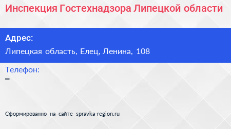 Инспекция Гостехнадзора Липецкой области по адресу Липецкая область, Елец, Ленина, 108 в дальнейшем Организация, размещена в следующих категориях:
