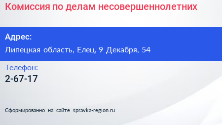 Комиссия по делам несовершеннолетних по адресу Липецкая область, Елец, 9 Декабря, 54 в дальнейшем Организация, размещена в следующих категориях: