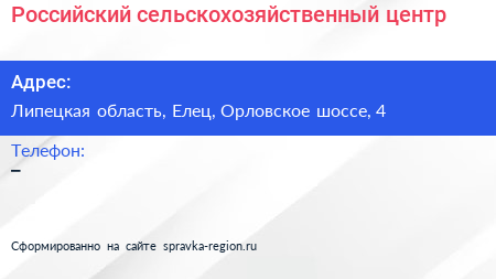 Российский сельскохозяйственный центр по адресу Липецкая область, Елец, Орловское шоссе, 4 в дальнейшем Организация, размещена в следующих категориях: