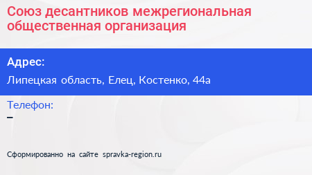 Союз десантников, межрегиональная общественная организация по адресу Липецкая область, Елец, Костенко, 44а в дальнейшем Организация, размещена в следующих категориях: