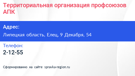 Территориальная организация профсоюзов АПК по адресу Липецкая область, Елец, 9 Декабря, 54 в дальнейшем Организация, размещена в следующих категориях: