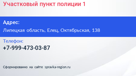 Участковый пункт полиции №1 по адресу Липецкая область, Елец, Октябрьская, 138 в дальнейшем Организация, размещена в следующих категориях: