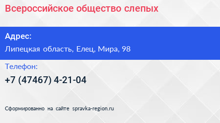 Всероссийское общество слепых по адресу Липецкая область, Елец, Мира, 98 в дальнейшем Организация, размещена в следующих категориях:
