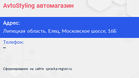 AvtoStyling, автомагазин по адресу Липецкая область, Елец, Московское шоссе, 16Б в дальнейшем Организация, размещена в следующих категориях: