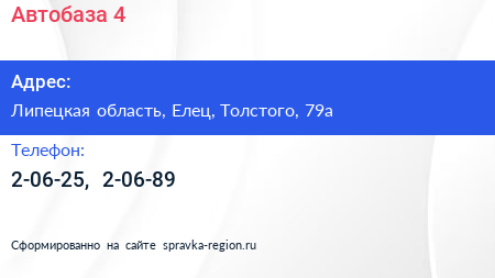 Автобаза №4 по адресу Липецкая область, Елец, Толстого, 79а в дальнейшем Организация, размещена в следующих категориях: