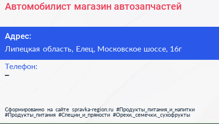 Автомобилист, магазин автозапчастей по адресу Липецкая область, Елец, Московское шоссе, 16г в дальнейшем Организация, размещена в следующих категориях: