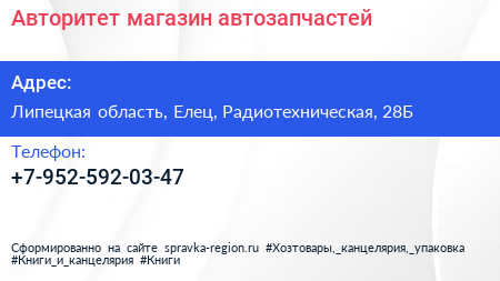 Авторитет, магазин автозапчастей по адресу Липецкая область, Елец, Радиотехническая, 28Б в дальнейшем Организация, размещена в следующих категориях: