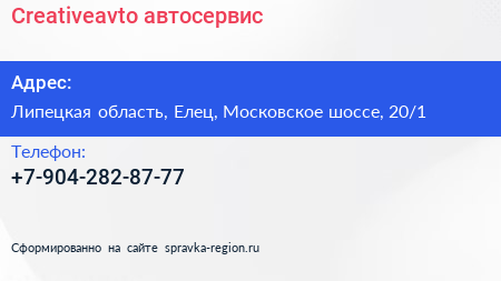 Creativeavto, автосервис по адресу Липецкая область, Елец, Московское шоссе, 20/1 в дальнейшем Организация, размещена в следующих категориях: