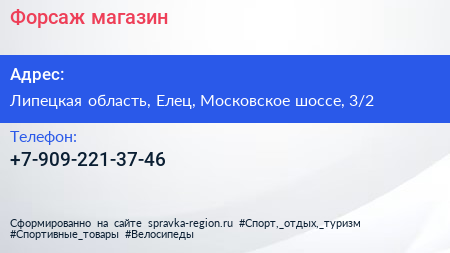 Форсаж, магазин по адресу Липецкая область, Елец, Московское шоссе, 3/2 в дальнейшем Организация, размещена в следующих категориях: