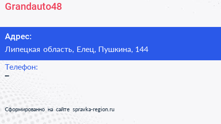 Grandauto48 по адресу Липецкая область, Елец, Пушкина, 144 в дальнейшем Организация, размещена в следующих категориях: